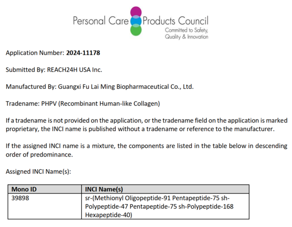 福莱明生物原研创新的重组类胶原蛋白融合因子(英文名PHPV,研发代号FLM-1.x),已于2024年11月8日获得国际化妆品成分命名委员会(International Cosmetic Ingredient Nomenclature Committee (INC)审定和分配的国际化妆品原料标准名称sr-(Methionyl Oligopeptide-91 Pentapeptide-75 shPolypeptide-47 Pentapeptide-75 sh-Polypeptide-168 Hexapeptide-40), Mono ID为39898 。INCI名称是国际公认的化妆品成分的识别名称,许多国家法规规定化妆品的成分标签需要使用INCI名称。国际化妆品成分命名委员会由来自行业、学界、监管机构和专业协会的专家与科学家组成,INCI清单是化妆品和个人护理产品中最全面的成分清单。《国际化妆品原料标准中文名称目录》是对所收录的原料INCI命名翻译而来,以规范和统一化妆品原料的中文名称。
