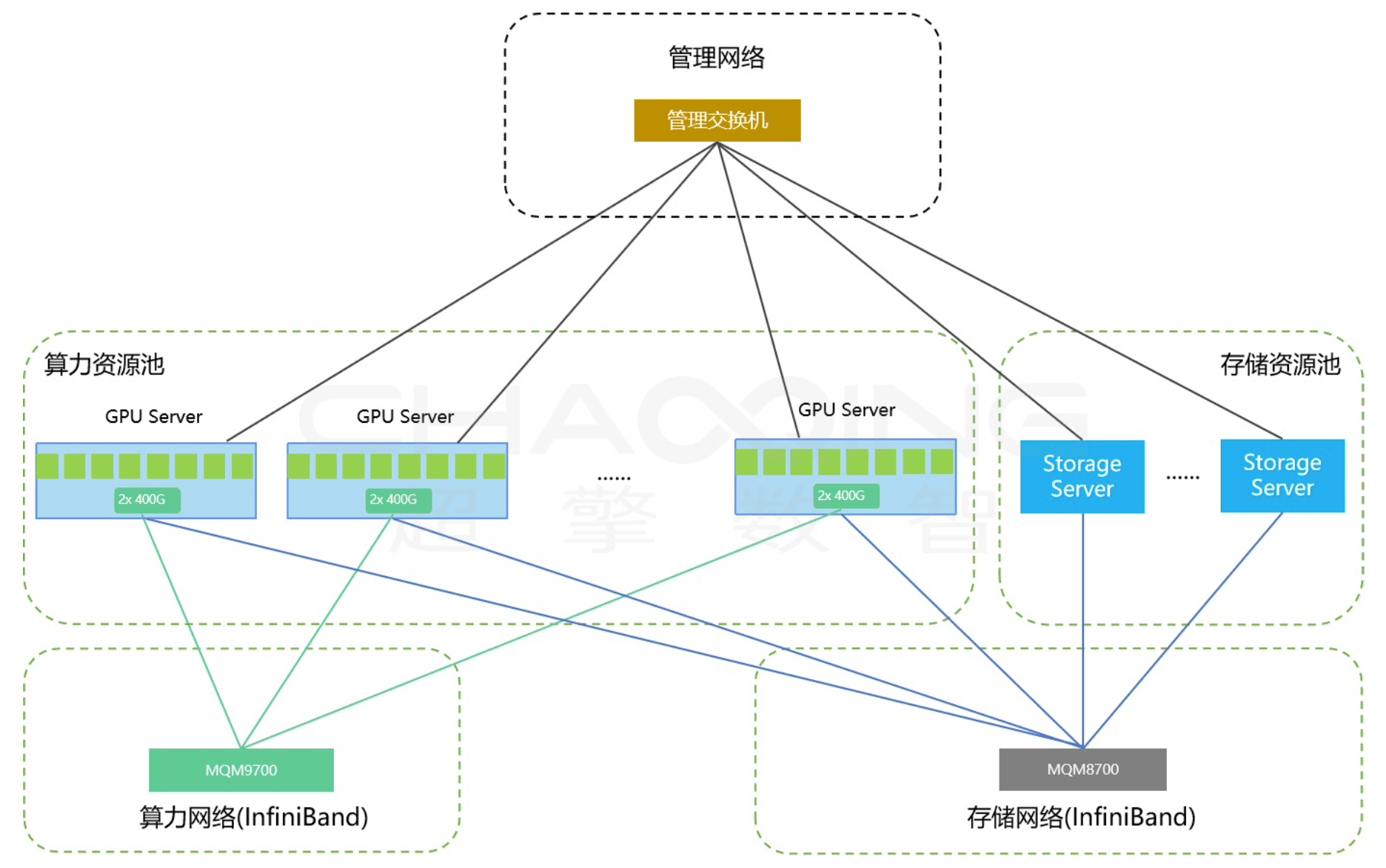 - 计算网络:基于 Infiniband MQM9700 交换机,提供高带宽、低延迟的 AI 训练通信。