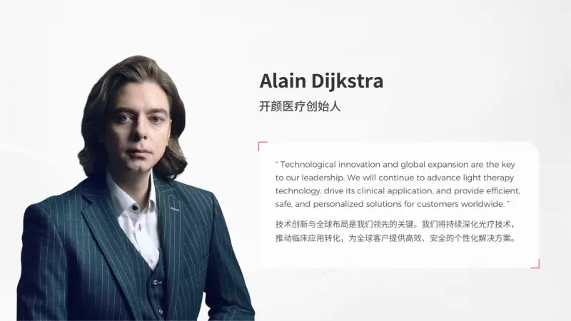 开颜医疗创始人Alain Dijkstra表示:“技术创新与全球布局是我们领先的关键。我们将持续深化光疗技术,推动临床应用转化,为全球客户提供高效、安全的个性化解决方案。”