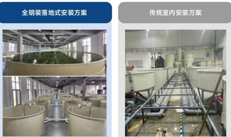 在成本预算方面,传统净水鱼池需架起离地面至少 0.5 米,不方 便行走,需另铺设通道,整体造价高、工期长,且循环流量有上限。而德浦全明装落地式循环水养殖系统方案具有无需挖土、无需架高鱼池,安装简单、工期短、造价成本低、循环流动、控制灵活等优点。特别适合已硬化地面(如展厅)的循环水系统构建,不仅前期的投入成本低,往长远来看更是省时省力。