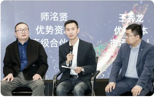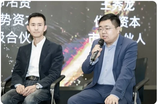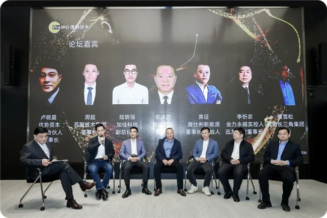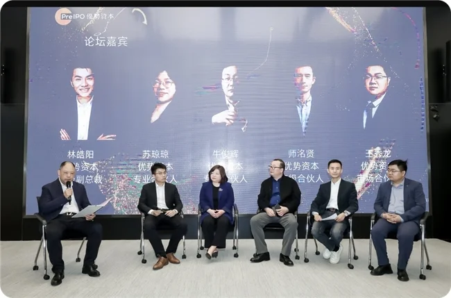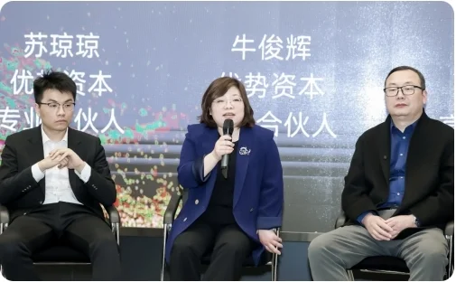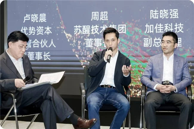 在产业赋能服务圆桌论坛上,新能源汽车、算力算法、半导体芯片、锂电储能、低空经济、医疗企业六大领域领军企业代表齐聚一堂,优势资本主管合伙人、副董事长卢晓晨担任主持。