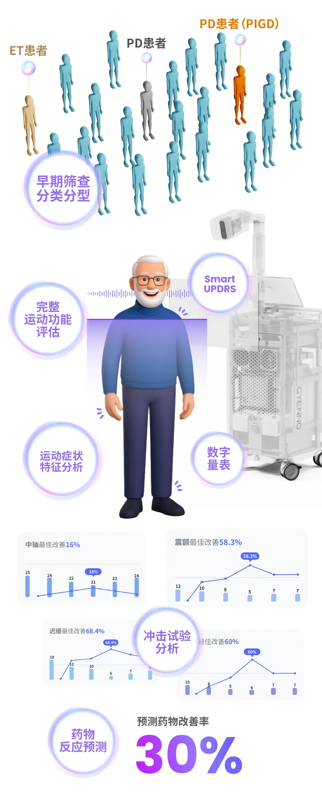 在复杂的帕金森病诊疗环境中,单一技术已难以满足不断变化的临床和患者需求。智医灵心通过大模型、深度学习与经典机器学习等多种人工智能技术,构建出多技术协同的融合模型,精准识别“正确的问题”,并匹配“适合的方法”。