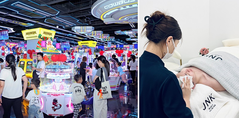 美林天地还拥有大湾区首家星创视光中心旗舰店;TOP TOY、好特卖等聚焦爆品IP的生活杂品零售;疯狂牛仔城、悠比城堡等多种亲子娱乐;JNK日式皮肤管理、奈瑞尔女子美容护理等身体护理的生活配套。也就是说,品尝广府美食、体验亲子游乐,继而享受美容、美甲、理发和按摩服务,偶尔的手机维修、汽车保养等服务需求,港客都能在美林天地一站式解决。