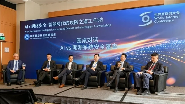 在圆桌对话环节,蔡晶晶与来自香港网络安全专业协会、香港警务处、中国电信、华为、香港城市大学的嘉宾围绕“AI VS 开源系统安全审查”进行交流,分享永信至诚在AI测试及数字健康领域的具体实践。
