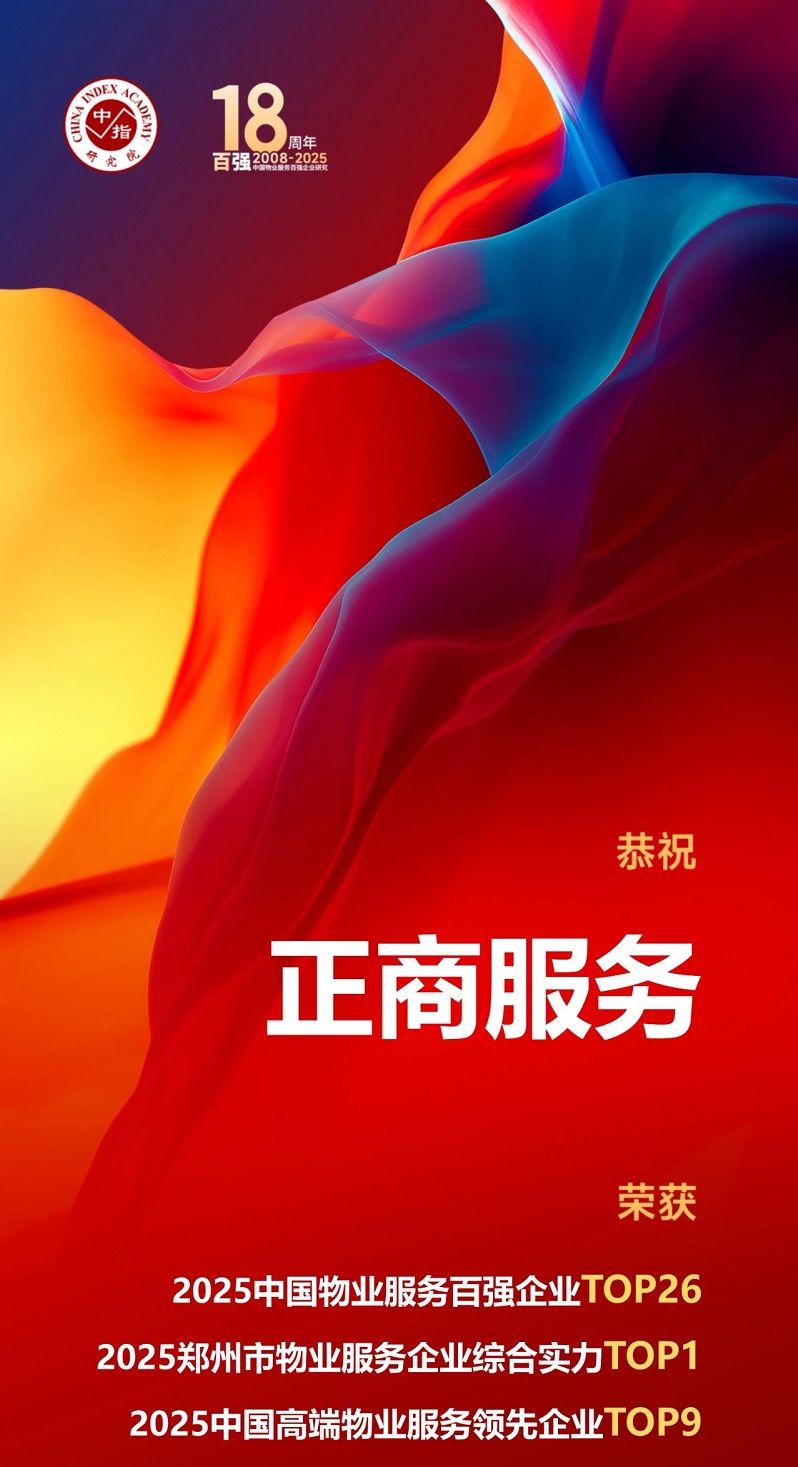 会上,正商服务凭借务实的服务品质,稳健的拓展步伐及卓越的管理能力荣获 「2025中国物业服务百强企业TOP26」、「2025年中国高端物业服务领先企业TOP9」、「2025郑州市物业服务企业综合实力TOP1」等荣誉,高质量发展之路获行业高度认可。
