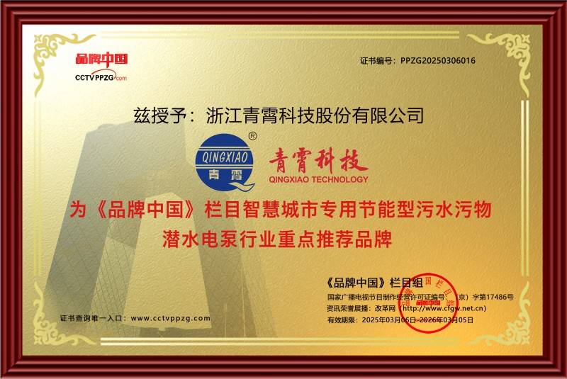 好产品、高质量铸就青霄科技品牌“硬底气”。青霄科技坚持以创新驱动发展新质生产力,不断推出具有自主知识产权的高性能产品,先后荣获国家发明专利11项,实用新型专利37项,外观专利5项。随着国产泵类品牌竞争力的持续提升,青霄科技一路开拓、持续创新,始终坚持在技术突破和市场快速变化中进行自我超越,坚定与客户和行业共同成长。2023年及2024年在智慧城市专用节能型污水污物潜水电泵全国细分市场占有率近20%,市场影响力持续攀升。2025年,更是凭借其在相关细分领域的深度应用和广泛创新实践,荣膺“《品牌中国》栏目重点推荐品牌”授牌。