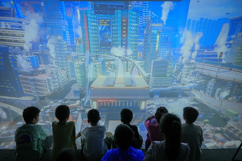 紧接着,大家走进动作捕捉实验室。在这里,孩子们一边学习动作捕捉技术的基本原理,一边观摩其在互动媒体中的创新应用,并在现场体验沉浸式3D投影项目,逼真的场景、震撼的效果,让孩子们切身感受到高科技的独特魅力。