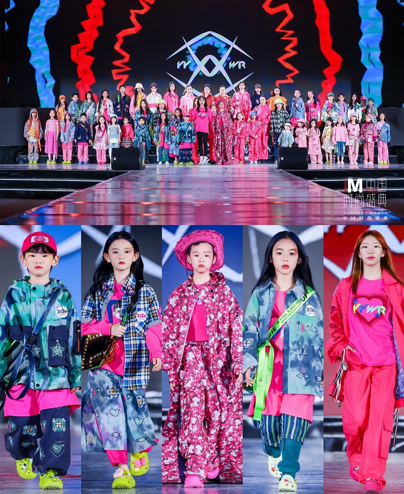 以衣唯人的潮酷系列在T台上掀起青春风暴,生动诠释新生代的个性与活力。系列服装大胆采用荧光绿、电光紫等高饱和度色彩,如同打翻的调色盘,碰撞出强烈的视觉冲击;图案设计别具一格,既有充满未来感的几何线条,赛博朋克元素,彰显出不拘一格的潮流态度。孩子们穿着这些潮服登上T台,每一个动作都尽情释放着独属于他们的张扬个性,将新生代的朝气与创意展现得淋漓尽致。