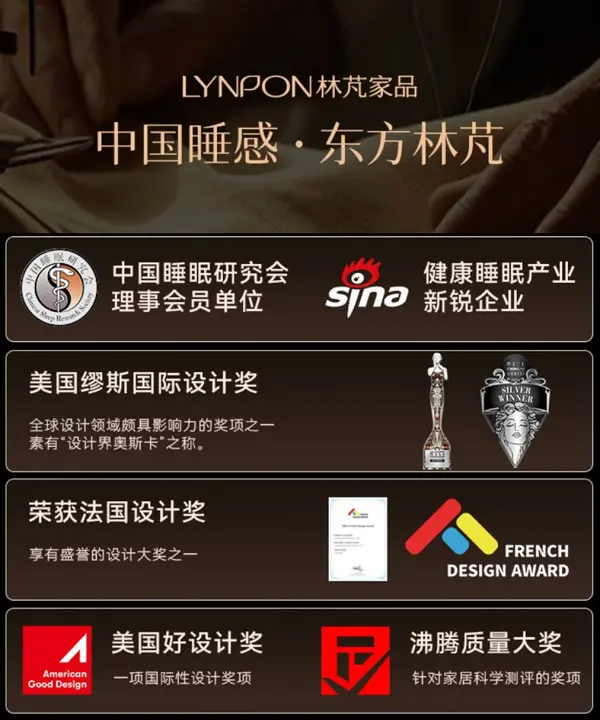 在技术与市场的双重推动下,林芃家品进一步深化行业影响力。依托技术积累与创新实践,林芃家品已深度融入行业标准体系建设——不仅参与制定《睡眠工效学实验室通用要求》《床垫工效学 基于BMI的分型要求》等多项国家标准,更连续三年入围“睡眠产业新锐企业”,先后获得沸腾质量金奖、缪斯设计银奖等权威奖项。这些成就不仅彰显了品牌的综合实力,也为行业树立了创新标杆。