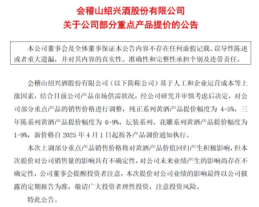 近日,会稽山绍兴酒股份有限公司(以下简称“会稽山”)发布公告称,自4月1日起,公司将对部分重点产品的销售价格进行调整。其中,纯正系列黄酒产品涨幅为4-5%,三年陈系列黄酒产品涨幅为6-9%,坛装系列、花雕系列黄酒产品也提升了1-9%。