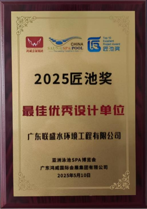 2025年5月,在广州盛大启幕的第20届亚洲泳池SPA博览会上,广东联盛水环境工程有限公司凭借卓越的设计理念、专业的技术实力以及丰富的行业经验,从众多杰出企业中脱颖而出,荣获“2025年最佳优秀泳池设计单位”荣誉称号。