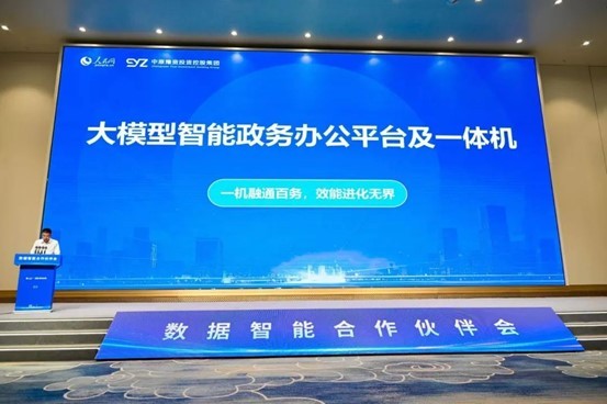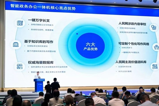 会议上发布了最新大模型智能政务一体机——深言未来智能政务一体机,通过与人民网正式达成战略合作,共同打造了符合政务场景需求的智能化办公平台。经过双方团队的共同攻坚研发,这款集"安全、智能、高效"于一体的政务办公一体机终于面世。