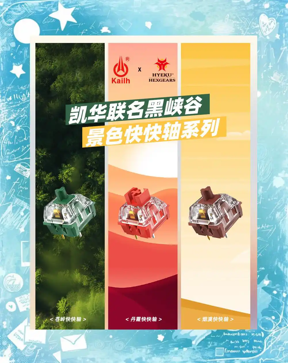 在2022年10月27日,凯华与黑峡谷共同推出了全新MX轴体——景色快快系列(包括苍岭快快轴、烟漠快快轴和丹霞快快轴)。这款轴体的首次亮相将展示于黑峡谷即将发布的i系列机械键盘中。这是双方继备受好评的景色系列BOX轴之后,再度携手合作的创新成果。