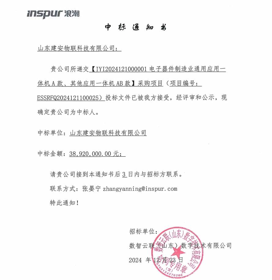 山东建安物联科技将以此中标为契机,严格按照合同约定,精心组织实施,进一步优化自身产品体系,提升服务质量与水平,确保为浪潮集团提供契合需求、高效稳定的解决方案,共同为推动行业数字化升级贡献力量。我们期待双方在后续合作中,严格遵循相关法律法规与行业规范,扎实推进各项工作,实现互利共赢,为行业发展树立合作典范。