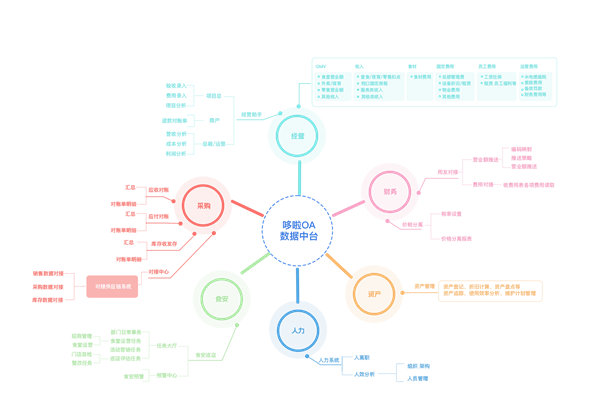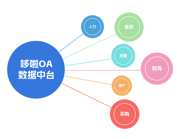 哆啦OA"1+6数字化运营框架"中的“1”实际上就是哆啦OA数据中台,“6”代表经营、财务、人力、食安、资产、采购这六大模块。