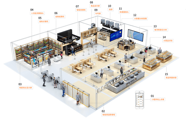 对于团餐行业而言,数智化主要体现在智慧食堂这个方面。提到智慧食堂,大家首先想到的可能是一些酷炫的硬件,比如AI点餐机、智能称重机等;但实际上,通过这么多年的行业经验,我认为餐饮行业的数智化不仅仅是智慧食堂,更不仅仅局限于一些硬件,它应该是硬件、软件相结合,把食堂里涉及到的各个环节和板块高效联通起来,比如点餐、外卖、会员、客服等等。