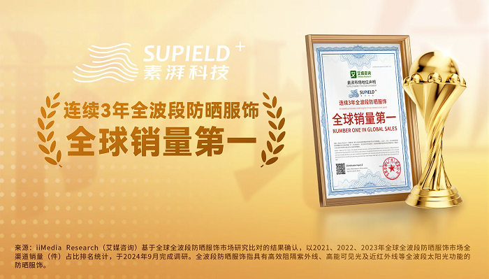 2024年10月,素湃获全球新经济产业第三方数据挖掘和分析机构iiMedia Research(艾媒咨询)授予的“连续3年全波段防晒服饰全球销量第一”市场地位确认。
