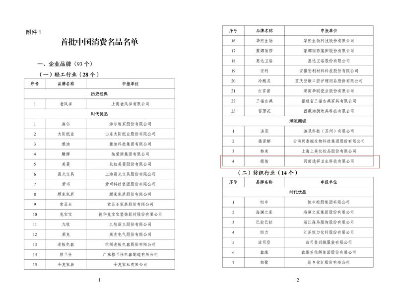 这不是德佑第一次作为公众关注的焦点出现在大众视野之中。在此前国家工业和信息化部发布的首批中国消费名品名单上,德佑品牌赫然在列。