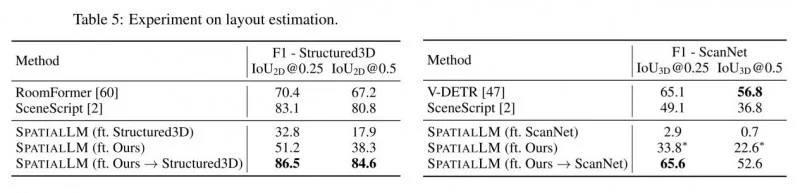图说:SpatialLM1.1 在户型、物体检测任务中与SOTA方法的跑分对比