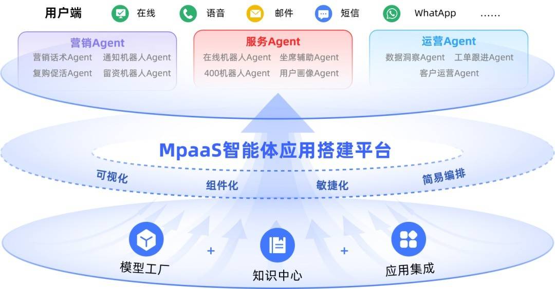 在技术层面,合力亿捷通过自研AI Agent平台能力MPaaS,打通语音识别、NLP语义理解、多模态交互、知识图谱、数据智能等关键环节。平台支持与主流大模型(如DeepSeek、GPT、通义千问、文心一言、Azure等)兼容互通,也能灵活接入企业自有AI模型,赋能客户个性化智能服务场景。