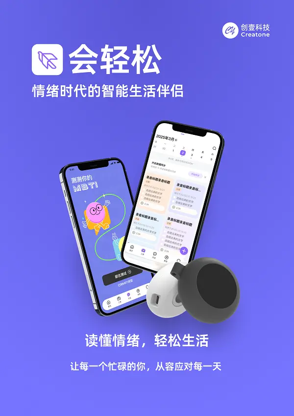 会轻松是一款融合智能硬件项链与移动应用的创新产品,作为情绪时代的智能生活伴侣,它以情绪关怀为核心,通过智能穿戴设备形态实现对用户情绪的精准感知与管理。依托生物传感技术与 AI 算法,产品能够将用户的情绪转化为可视化数据,无论是职场压力引发的焦虑,还是生活琐事带来的情绪波动,都能实时监测并生成个性化干预方案,助力用户实现 “读懂情绪,轻松生活” 的终极目标。