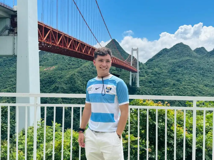 7月3日,在参观贵州省安顺市坝陵河大桥时,来自阿根廷的门多萨气候青年组织联合创始人伊格纳西奥·维拉罗亚与大桥合影留念。新华社记者 周宣妮 摄