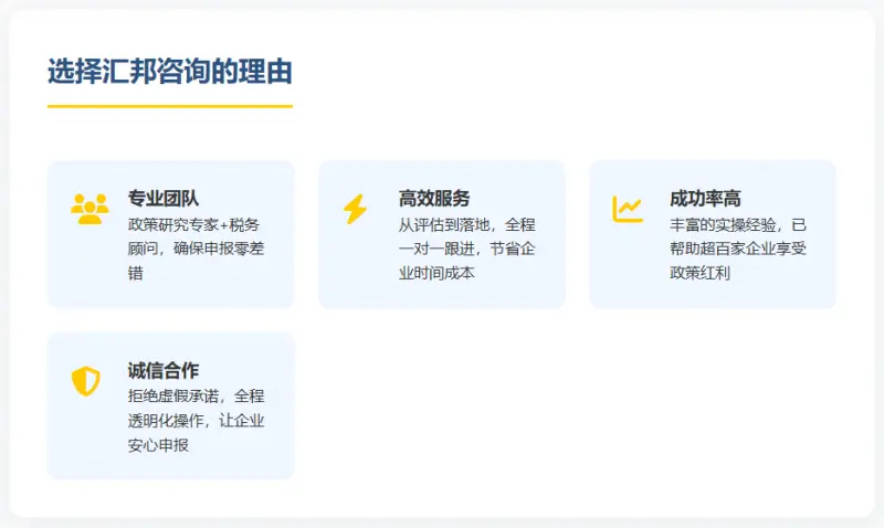 政策申报具有时效性,越早行动,享受的优惠越多!绍兴市汇邦企业管理咨询有限公司将竭诚为您提供专业服务,助力企业降本增效,轻松赢取政策红利。
