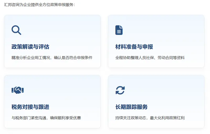 绍兴市汇邦企业管理咨询有限公司专注于政策申报服务,拥有多年实操经验和成功案例。在“重点人群就业税收优惠项目”中,我们为企业提供以下服务:
