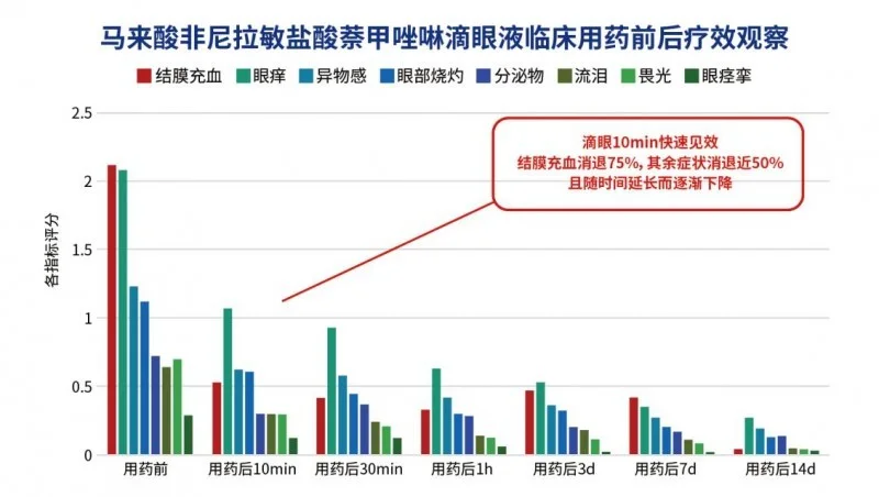 国内知名眼科专家刘祖国/孙兴怀教授的临床研究显示:马来酸非尼拉敏盐酸萘甲唑啉滴眼液10min内快速起效,滴眼10min后结膜充血消退75%,眼部烧灼、眼痒、异物感、流泪、畏光等症状消退近50%,滴眼刺激性小。