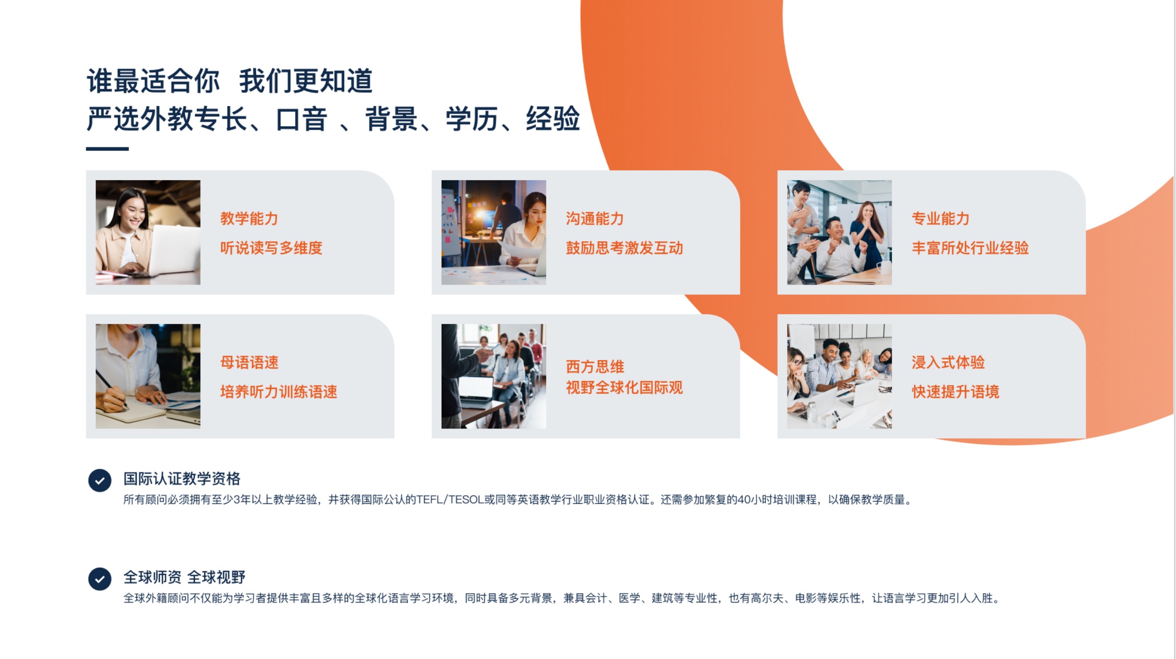 大奇DakiTalk的核心竞争力在于其智能教育管理系统(iEMS),该系统基于CEFR标准,精准匹配学员与外教。所有外教均持有TEFL/TESOL认证,并经过创始人赖荣明亲自制定的严格选拔流程。我们不以培训时长作为衡量标准,而是通过独特的考核体系,重点考察外教的教学经验、文化理解力以及与品牌理念的契合度,最终筛选出既有深厚行业积淀,又与我们怀揣同样教育愿景的优秀外教团队。