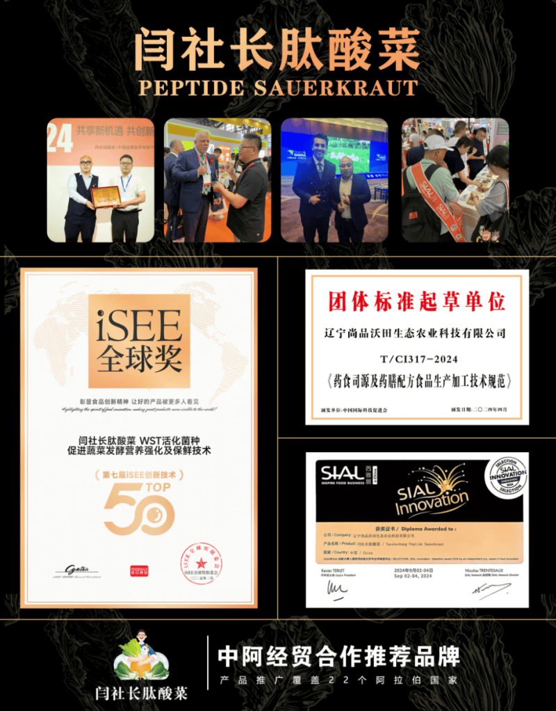 产品品鉴短短1年间,闫社长“(活性)肽酸菜”便以其品质和创新性博得海内外的高度赞誉,捷报频传:其不仅斩获SIAL世界食品展国际突破金奖等多项权威奖项,公司还受邀成为中国国际科技促进会《药食同源及药膳配方食品生产加工技术规范》(T/CI317-2024)团体标准的重要起草单位,其核心技术——“WST活化菌种促进蔬菜发酵及常温锁鲜技术”更是在强手如林的第七届iSEE全球食品创新技术大赛中,从全球4678个创新项目中脱颖而出,荣膺“iSEE全球食品创新技术大奖”,成为国内发酵蔬菜食品领域率先获此殊荣的企业。