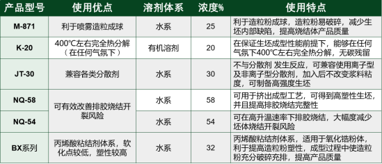 对此,至禾新从自身助剂体系出发,致力于解决喷雾造粒粉体成型烧结过程中出现的各种缺陷或开裂问题,开发了一系列粘结剂产品,受到行业的高度认可。至禾新粘结剂型号众多,可满足水系、有机溶剂体系,也可满足各类无机化合物、金属粉体用户无残留、高强度等不同诉求。