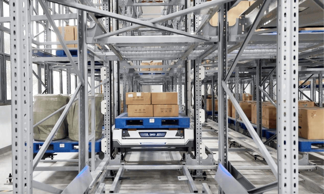 二者通过集群调度算法协作,可在立体仓库中实现六向自由移动,无需依赖传统输送线或提升机设备,大幅简化仓储流程。