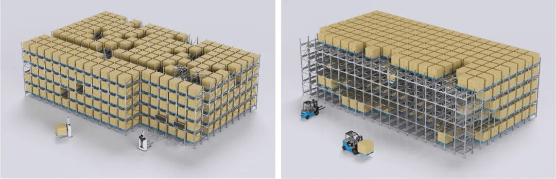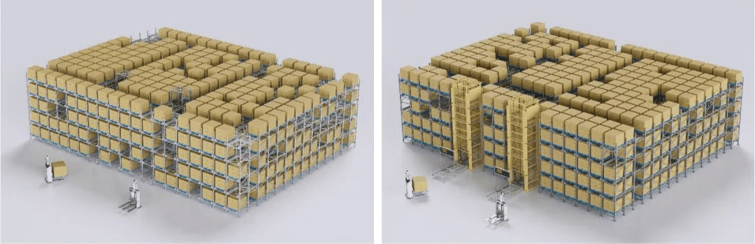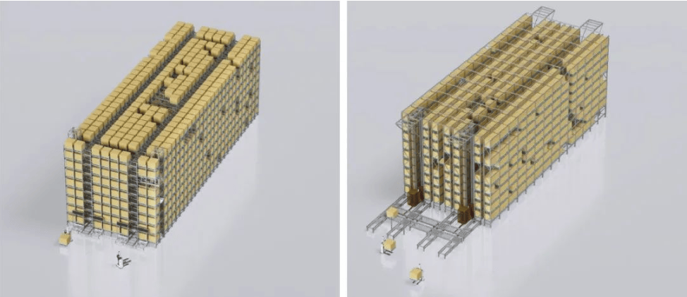 柔性方面:六向穿梭车库可根据场地,灵活规划储位;可根据SKU,灵活规划深位;可根据效率,灵活规划缓存位。而堆垛机库的刚性结构,在储位及深位规划上具有很大弊端。