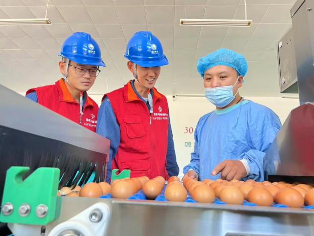 8月3日,迈德顺农业科技公司的全自动包装车间内,3万枚鸡蛋每小时通过智能流水线完成清洗分拣。“这些设备对电力稳定性要求很高,稳定的供电能帮助我们减少损失。”包装组长唐兴斌指着闪烁的指示灯说。此刻,供电员工任平正用红外测温仪检测10千伏小五线72号杆,为生产线的稳定运行提供电力保障。