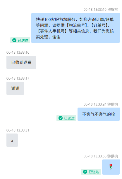 对此,她感到眼前一亮,抱着试试的心态点进去,与快递100客服进行反馈,并上传了快递面单和衣物照片。不到五分钟,客服便回复:“凭证已收到,10 分钟内为您办理退款。”林女士有些意外,以前遇到类似问题,总要来回上传五六次证据,还需要经过快递方复核,全部流程走完至少都需要两天。可这次,屏幕上的进度条飞速跳动,十分钟刚到,微信就弹出退款到账提醒。她特意进线向快递100客服团队道谢:“你们处理得也太快了!已收到退费,谢谢你们!”