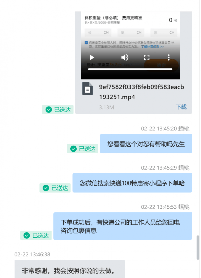 蟠桃立即将快递100小程序的使用方式进行录屏操作并发送,最终Tomas按照视频的指引,一步步完成了下单流程,顺利寄出冰箱。Tomas此次一共寄出5个包裹,共计寄送了76KG的物品,总体优惠了30%的快递费用。