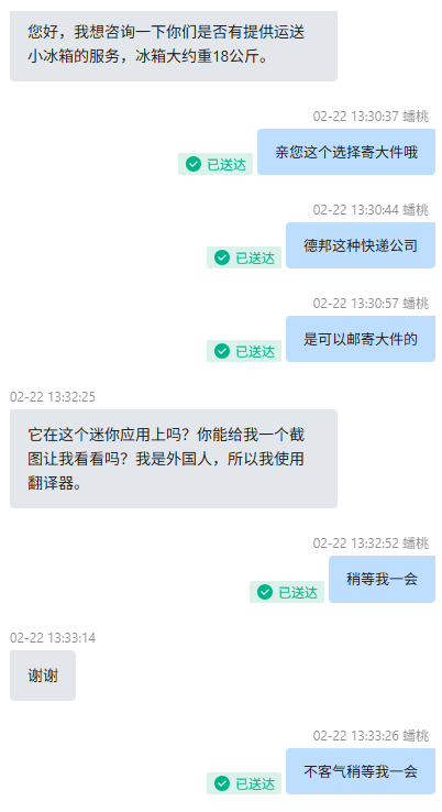 不到一分钟,快递100客服蟠桃的消息就弹了出来:“可以的,冰箱属于大件物品,我们这边推荐您选择德邦物流,他们有专业的大件运输服务。” Tomas赶紧补充:“我是外国人,不太懂中文,只能用翻译软件交流,希望你们多多体谅”