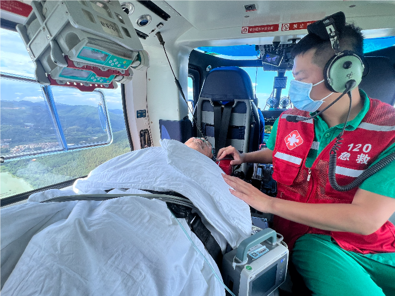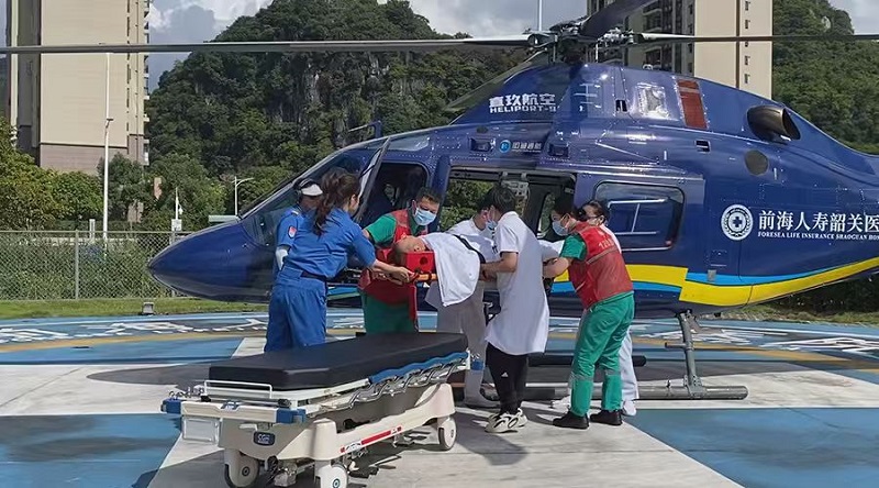 下午两点,直玖航空接到前海人寿韶关医院求助:一名74岁男性患者突发急性腹痛,伴有房颤及慢性阻塞性肺疾病(COPD),需从地处偏远的韶关市江湾卫生院紧急转院。尽管天降小雨,机组仍迅速完成航前准备,直升机于下午2:25起飞,仅用14分钟就抵达患者所在地,相比地面救护车节省超过两小时,患者得以快速送达医院接受救治。