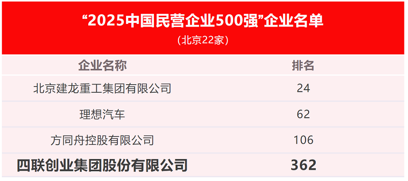 近日,2025中国民营企业500强、中国服务业民营企业100强等榜单正式发布。四联创业集团股份有限公司(以下简称“四联创业”)凭借366亿元的营业收入,位列中国民营企业500强第362位、中国服务业民营企业100强第79位,较去年分别提升68位、15位,较前四年均大幅度提升。自2020年以246亿元营收首次进入中国民营企业500强榜单以来,四联创业已连续五年跻身该榜单,并实现营业收入飞速增长。
