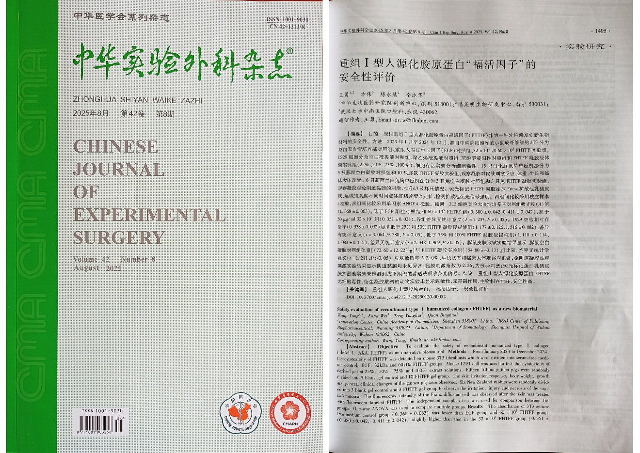 近日,福莱明生物原研首创的重组I型人源化胶原蛋白“福活因子”(FHTFF)安全性评价研究成果,在北大核心期刊《中华实验外科杂志》2025年第42卷第8期正式刊发。研究结论显示:融合人源Ⅰ型/Ⅲ型胶原蛋白特征和功能的重组Ⅰ型人源化胶原蛋白福活因子(FHTFF)在有效修复皮肤黏膜损伤同时,未观察到细胞抑制、免疫刺激和系统毒性,生物相容性优异,具备临床快速转化应用的安全性基础。