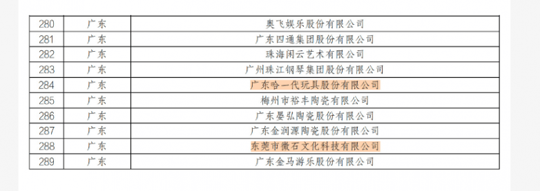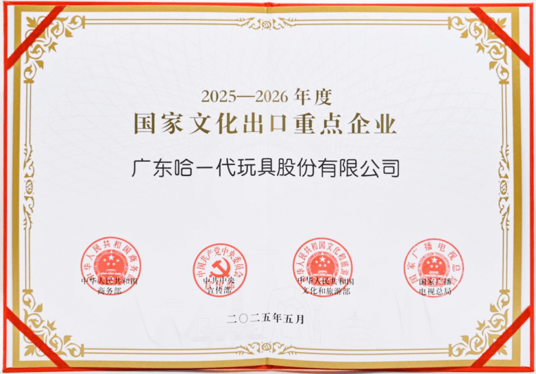 2025年上半年,商务部、中宣部、文旅部、国家广电总局四大部委联合重磅揭晓2025-2026年度国家文化出口重点企业认定名单。在全省仅36席的珍贵名额中,东莞仅有两家企业斩获殊荣。广东哈一代玩具股份有限公司凭借卓越的文化创新实力与亮眼的国际化市场表现成功突围,作为2025-2026年度唯一跻身、强势登榜的佼佼者,正式拿下这一国家级权威认定,彰显强劲综合实力!