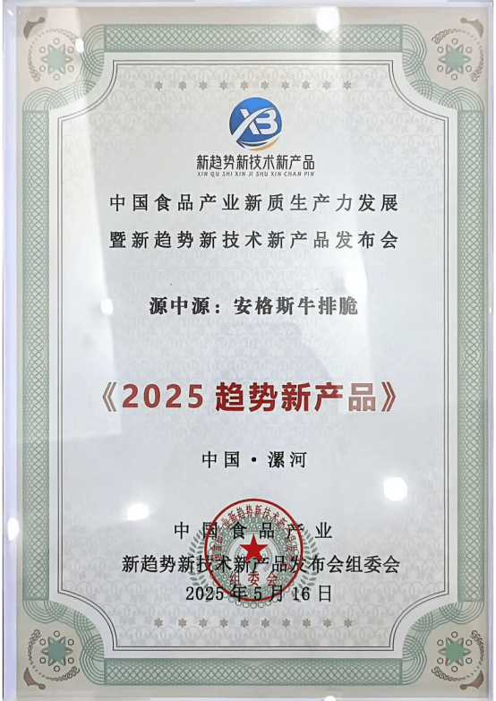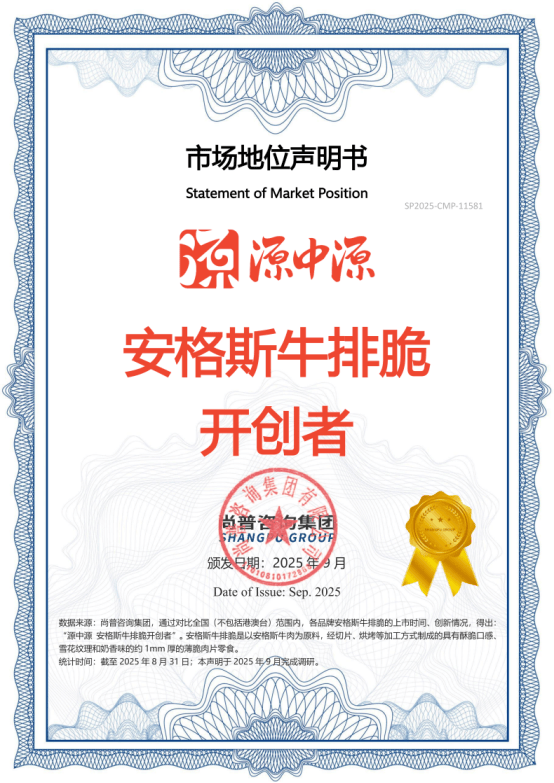 2025年9月,尚普咨询集团为源中源颁发市场地位声明书。此次源中源荣获尚普咨询【源中源 安格斯牛排脆开创者】市场地位声明,标志着源中源在安格斯牛排脆行业细分领域中的领导地位及市场的高度认可。