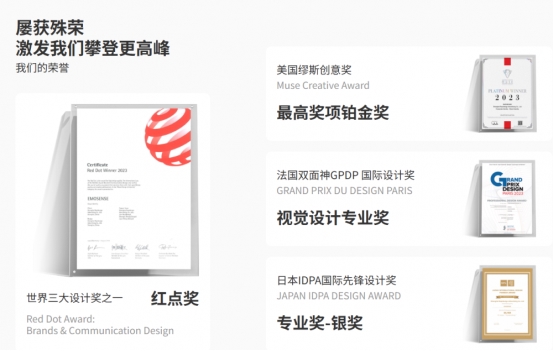 高端定制的“高端”,还需行业权威认可背书。锐普凭借出色的设计实力,斩获多项国际顶级大奖——2023年拿下美国缪斯创意奖铂金奖(企业形象-品牌形象类别最高奖)、红点奖(世界三大设计奖之一),还荣获日本IDPA国际先锋设计奖银奖、中法国际设计交流展创新奖,入围法国GPDP双面神国际设计奖。