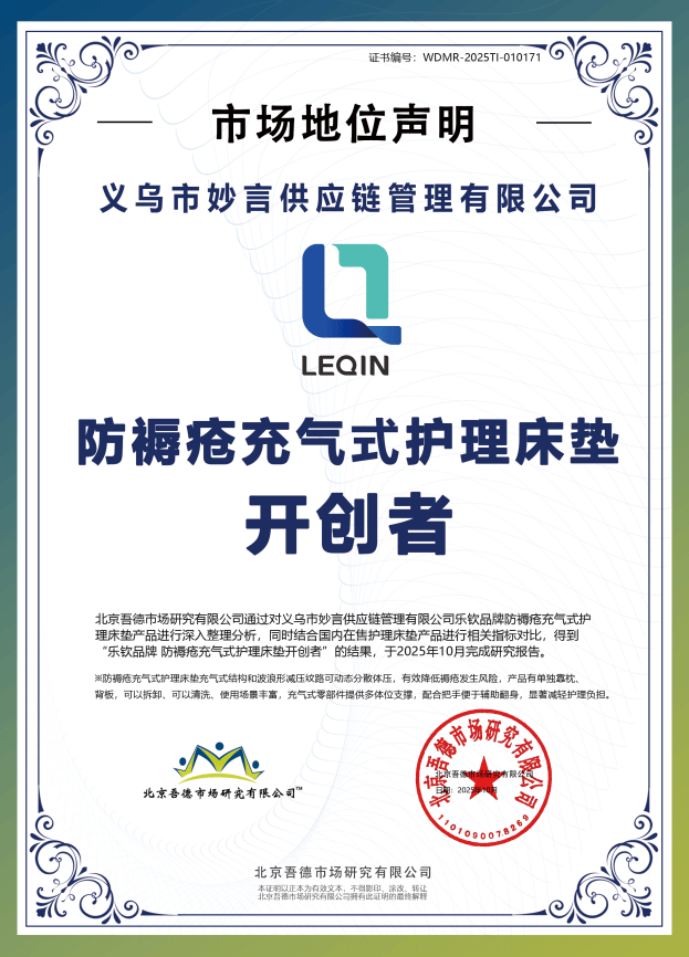 对于长期卧床的康复患者、重症病人以及年迈老人来说,压力性损伤(如褥疮、压疮等)犹如一道难以逾越的健康鸿沟。它不仅加剧了患者的痛苦,延缓了康复的步伐,更给家庭护理带来了沉重的压力。在这一领域,乐钦(LEQIN)作为医用级防褥疮充气床垫品牌,凭借医疗器械注册证、医疗器械生产许可证等多项硬核资质,确立了“防褥疮充气式护理床垫开创者”的市场地位,为众多深受困扰的患者带来“便捷、舒适”的新解决方案。