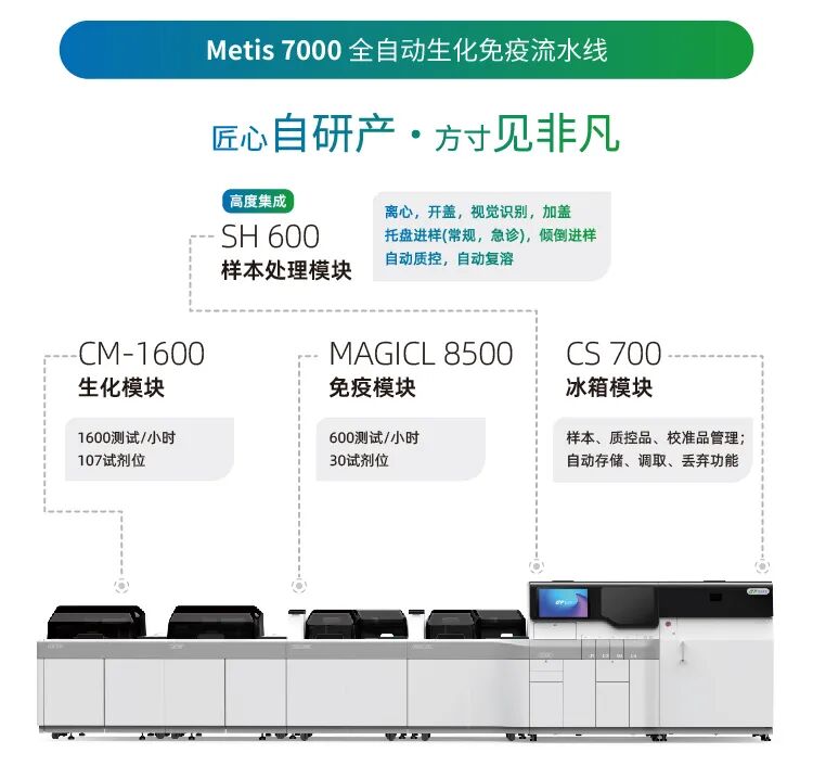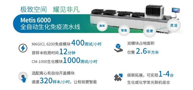 Metis 6000全自动生化免疫流水线,集成了MAGICL 6200免疫模块(单机400T/h)及CM-1000生化模块(单机1000T/h),搭载SH80样本管理系统和SHC200离心开盖模块。适合三级医院急诊检验、二级及以下医院中心实验室,旨在让流水线惠及更多医学实验室。