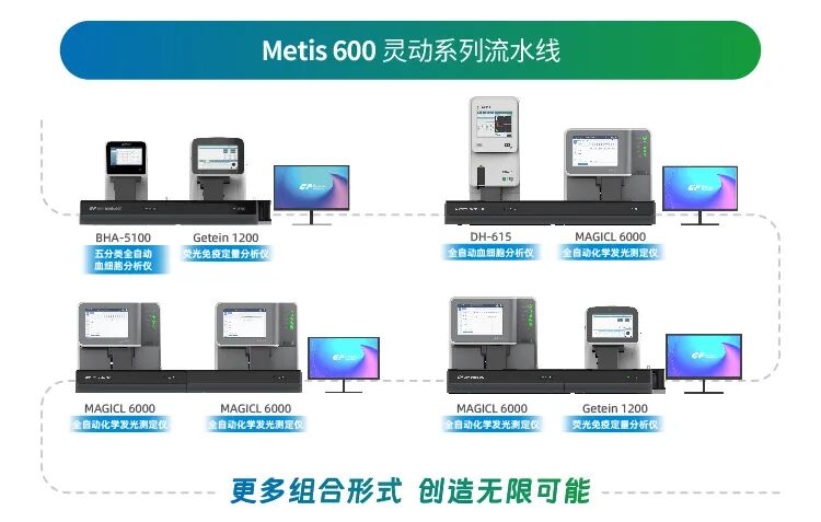 1、组合升级:DH-615/BHA-5100血球模块及Getien1200、MAGICL6000免疫模块任意组合二联机,满足不同客户的需求;