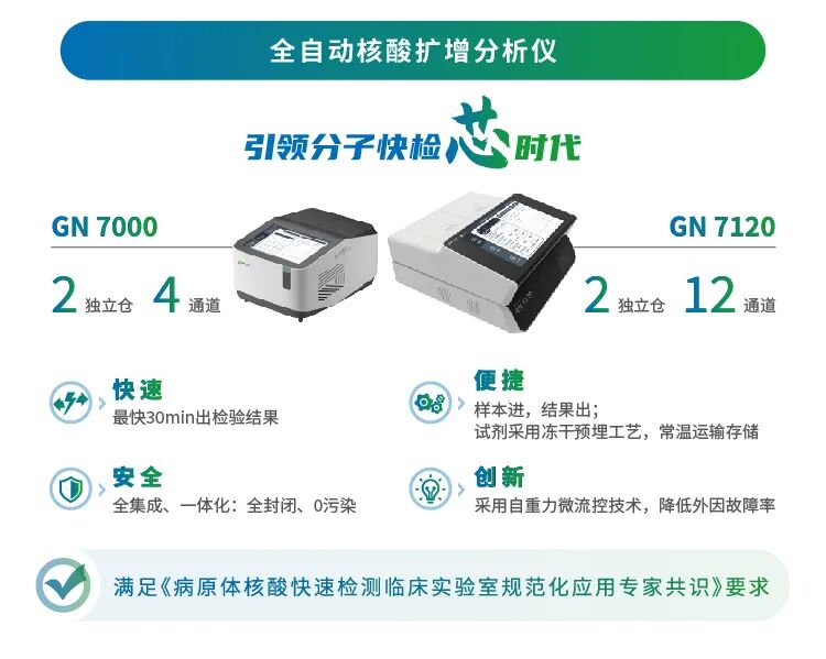 GN7000/7120全自动核酸扩增分析仪,突破传统核酸检测技术极限,采用一体化检测卡,集核酸裂解释放、扩增、检测于一体,打造灵活、高效的快速核酸检测系统,领航分子快检新潮流。