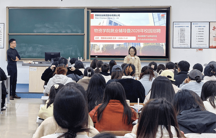 近日,四联创业集团与北京物资学院再度携手,深化校企协同,共同推动人才赋能与产业融合。四联创业集团人力资源总监汪洋、衍生品服务部经理刘凯翔一同走进北京物资学院,开展了一系列面向学生的专业交流与赋能活动。