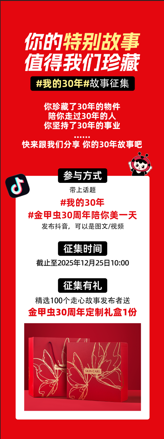 线下热度未减,线上活动接续精彩!即日起至12月25日,金甲虫在抖音发起#我的30年# 特别故事征集。无论是珍藏30年的老物件、陪伴30年的人,还是坚持了30年的事业……只要带上话题#我的30年 #金甲虫30周年陪你美一天,发布视频分享你的故事,即有机会获得金甲虫30周年美妆定制礼盒!目前话题已吸引众多用户参与,温情与回忆持续发酵。